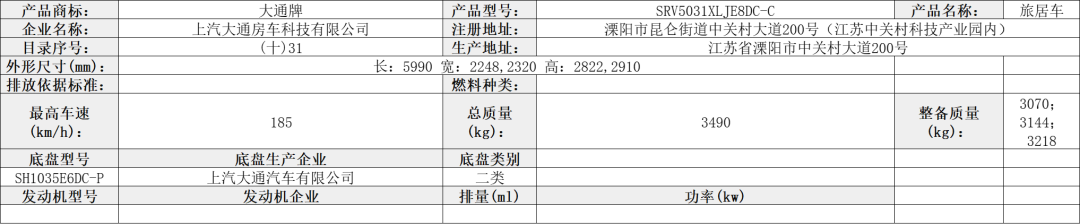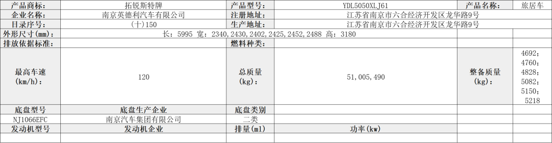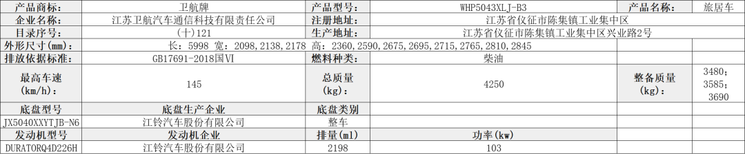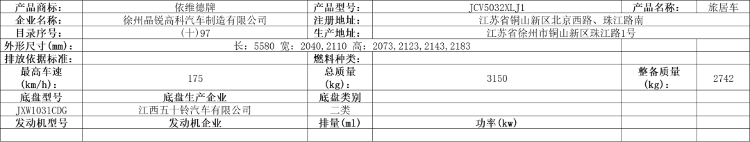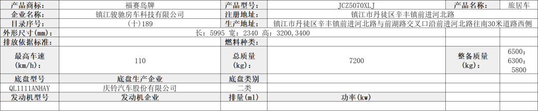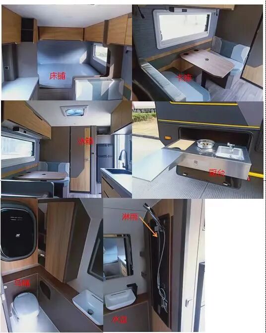 该车装有睡具(由沙发转换而成)、厨具和卫生间等旅居专用设备;牵引杆深入量为40mm;该车为非乘用车,行驶过程中不载人;顶部封闭,不可开启;选装轮毂;后部选装无备胎,无备胎架,此时长度为4900mm,对应的后悬为1595mm;侧面选装无遮阳棚,此时宽度为2200mm;整备质量时鞍座承载质量为100kg;悬架型式为独立螺旋弹簧悬架;轮胎负荷指数112;卫生间的水龙头是抽拉式的,淋浴时用。