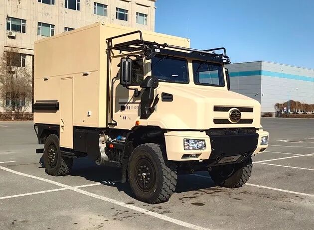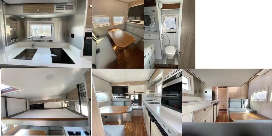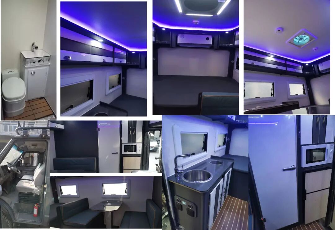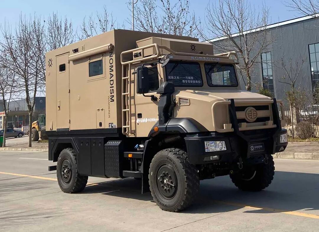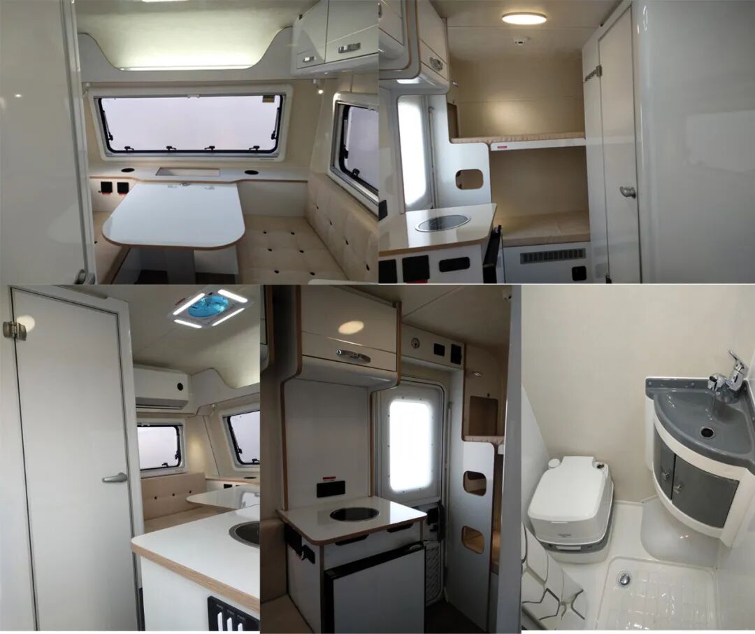 该车侧防护和后防护由车身结构代替,车辆后部离地高度为380mm;车内装备桌椅、卧具、厨具、卫生间、烟雾报警器等设施;该车型可选装直接供电式ETC车载装置;车辆后部和左侧仅在未行驶状态下使用的拓展舱;