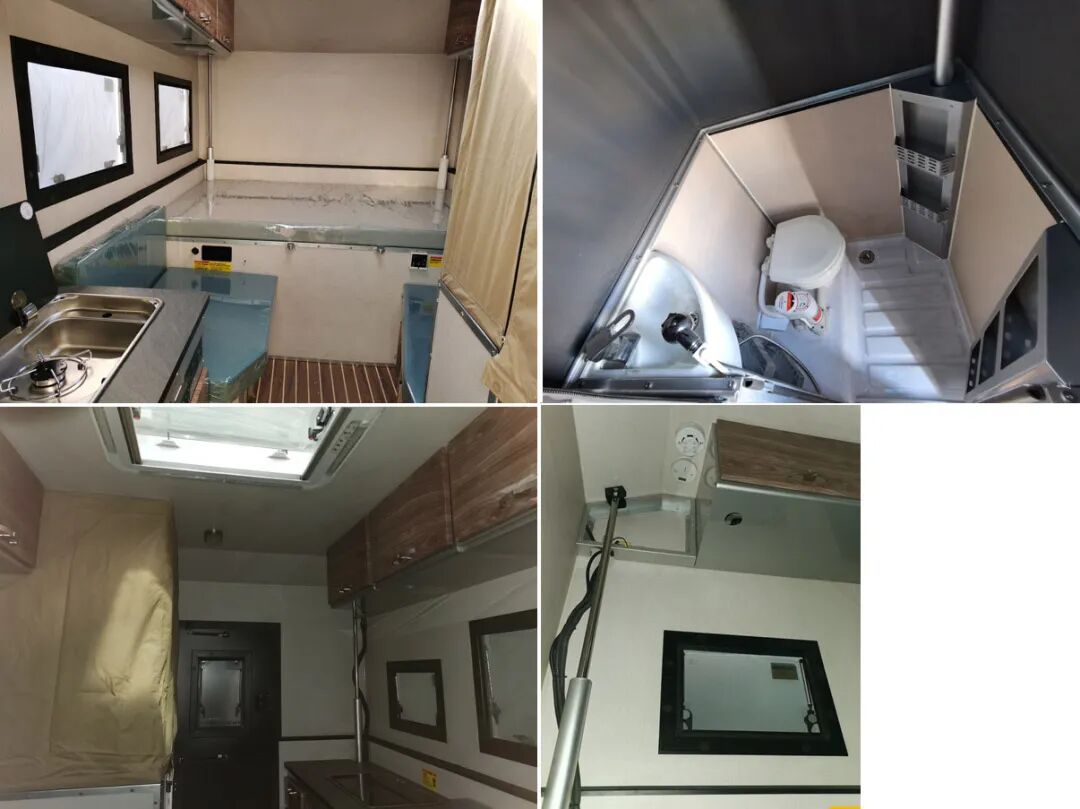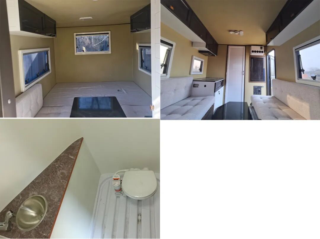 1.车厢顶部封闭,不可开启;2.本车为非乘用车,行驶过程中不载人;3.厢体内安装有床铺桌柜卫生家电炊事等设施;4.根据内部布局选装外观样式 ;5.顶部排布不同布局的太阳能板;6.遮阳帘为选装件,选装时整车宽度为2170mm,未选装时整车宽度为2080mm;7.中置轴挂车的牵引杆深入量(mm):40;8.中置轴牵引杆连接器最大负荷(kg):100。