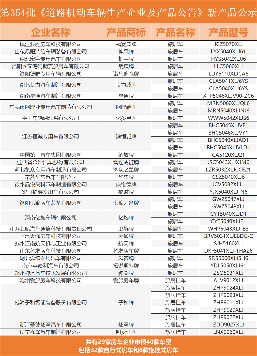 2022年3月13日,国家工业和信息化部在官方网站公示了354批关于《道路机动车辆生产企业及产品公告》(以下简称《公告》)新产品,共有29家房车企业申报40款车型,包括32款自行式房车和8款拖挂式房车。本次公告车型中,上汽大通MAXUS、诺马迪森、拓锐斯特、览众等知名房车企业均申报了新款车型,隆翠房车申报了新款拖挂房车。