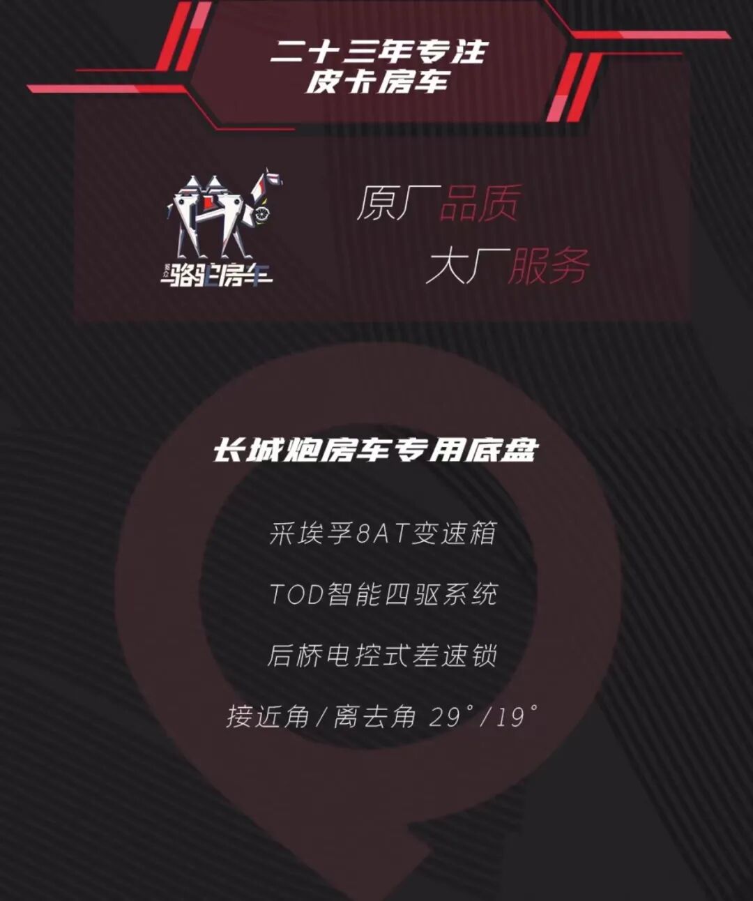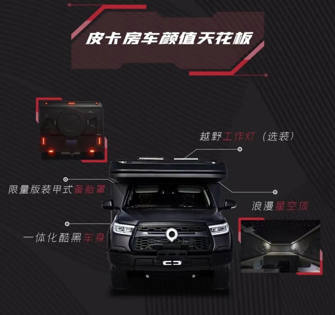 外观来看,升顶炮一改以往车型的浅色车身,直接采用一体化黑色哑光漆喷涂,整车质感十足!霸气十足的越野前脸、酷酷的顶部工作灯、装甲式备胎罩将行业皮卡房车颜值拉升了新的高度!