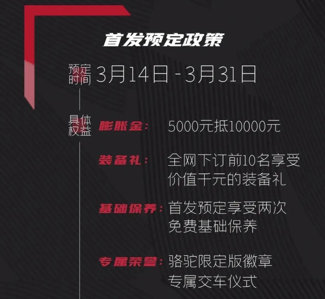览众骆驼房车2022年首推车型升顶炮正式上市,官方指导价越野版(柴油)42.8W,城市版(汽油)40.6W。现在下定享受5000元抵10000元的政策,并且享有千元装备礼、基础保养、专属交车仪式等权益。