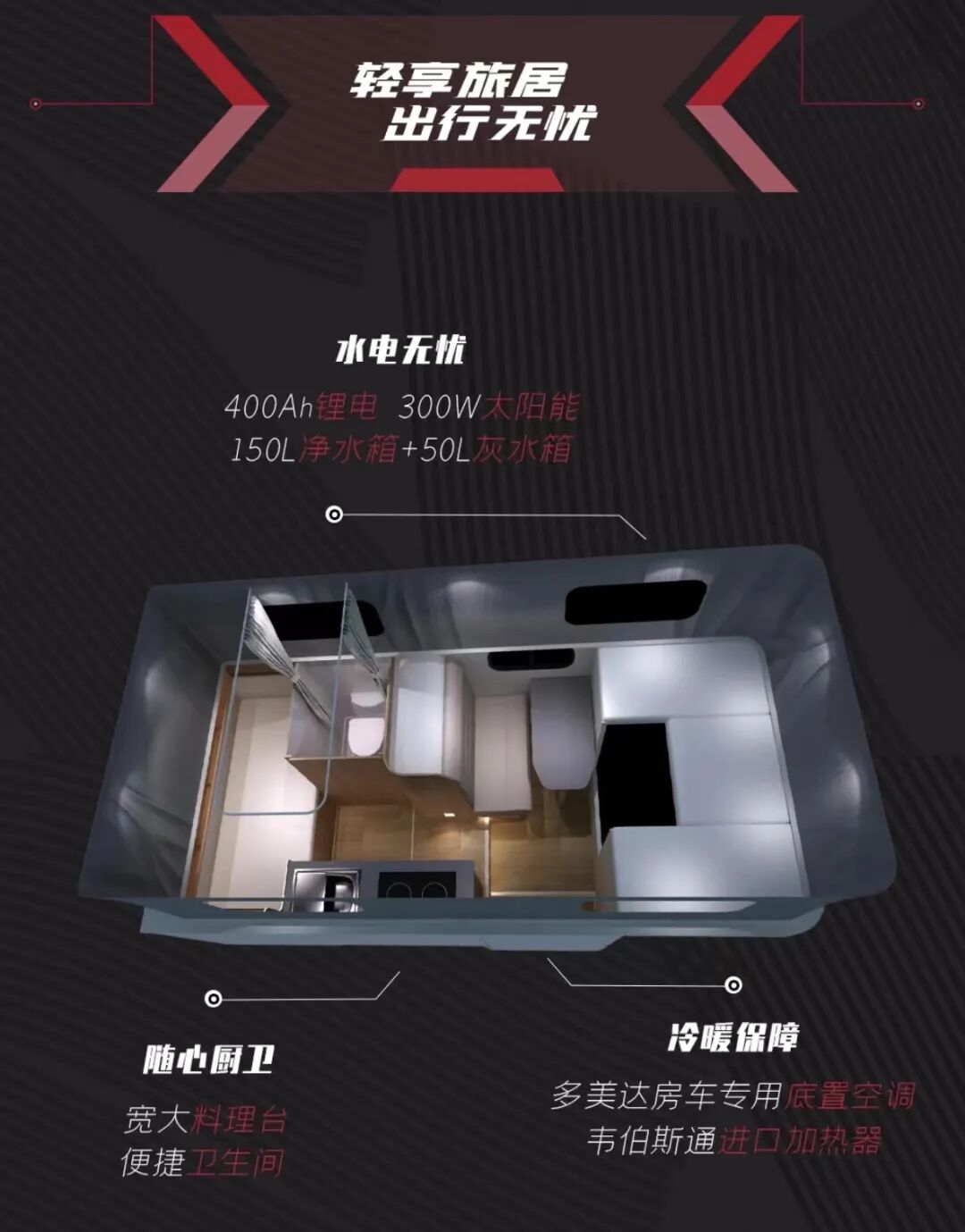 在生活配置上采用了400Ah大厂锂电、300W太阳能;用水方面采用了150L净水箱+50L灰水箱。厨卫区域依旧是升顶炮的亮点,宽大的料理台让每一次出行都有享受美食的冲动,而卫生间更是贴心设计了便捷式马桶以及冷暖淋浴。在冷暖保障上,车内采用了多美达房车专用底置空调,加装了韦伯斯通5Kw柴暖,确保冬夏季节正常用车。