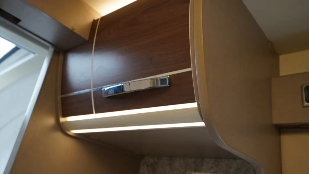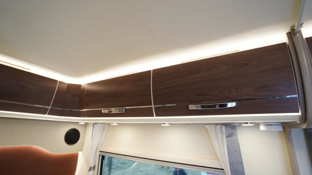 尾部休息区设有纵床,尺寸为1900x1350/1100mm,供日常休息使用;顶部设有L型储物吊柜,储物空间充足,足以收纳日常衣物用品。