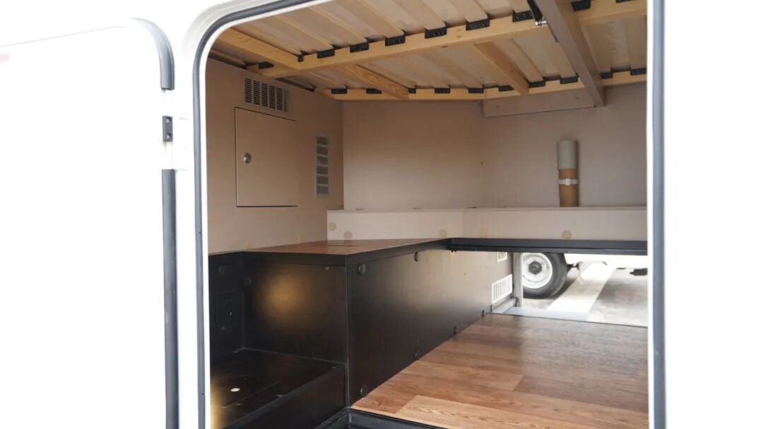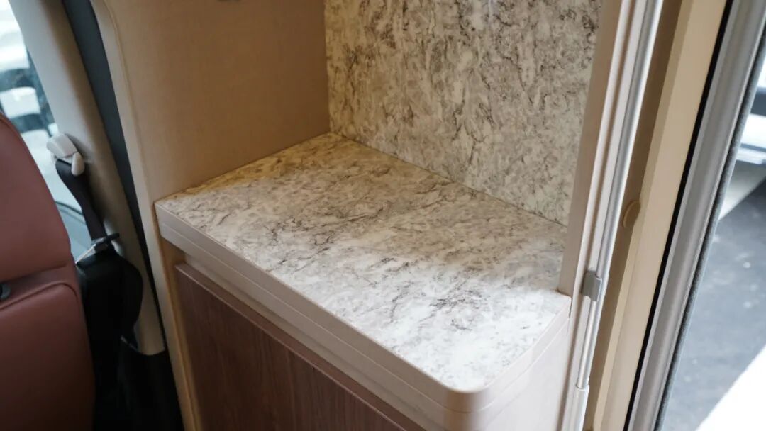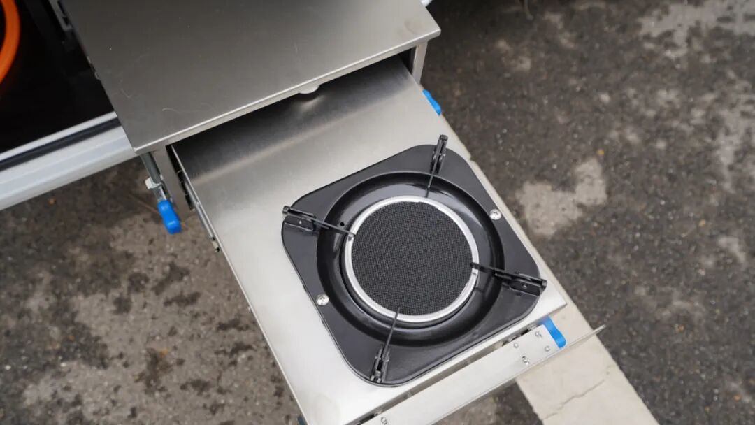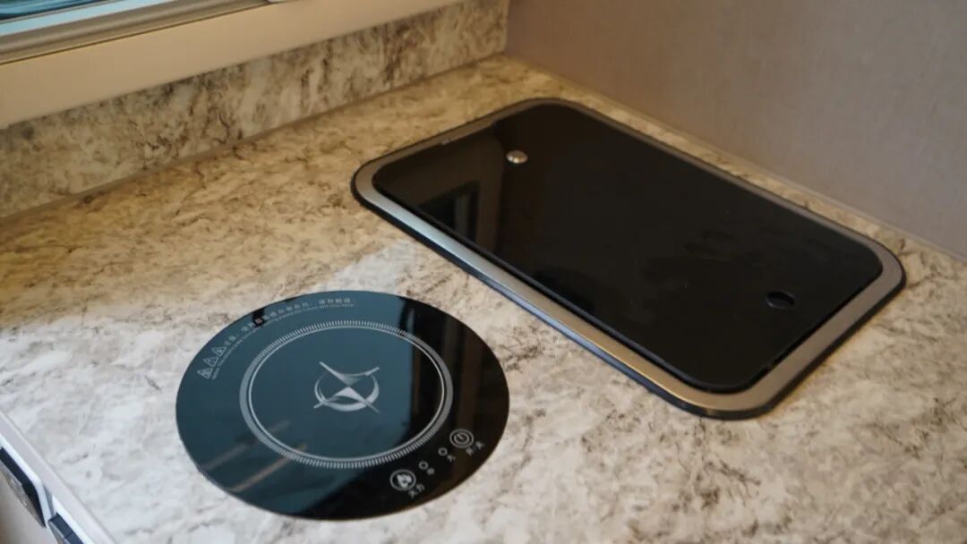沙发座椅前方设置了方形餐桌,可作为日常就餐、办公区使用;值得一提的是,这款房车的餐桌设置了隐藏式茶台(盖板为磁吸式,座椅侧方墙面设有磁扣用于放置),搭配烧水工具,方便户外旅行时泡茶、品茶,为旅行带来品质生活享受。此外,方形餐桌在不使用时可进行拆卸,放置于贯通式储物舱内,增加乘坐空间。