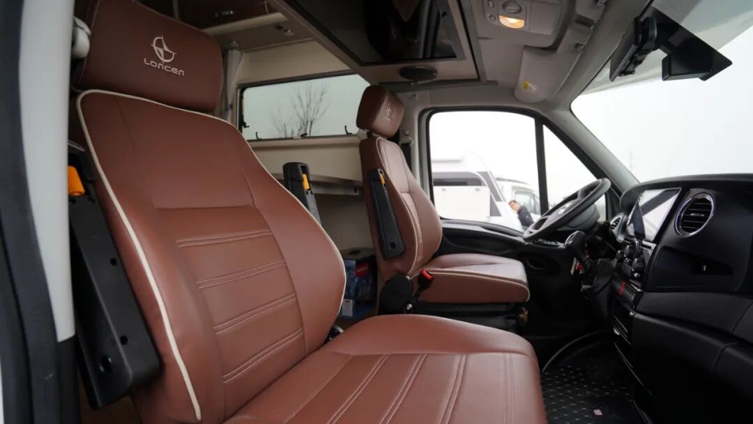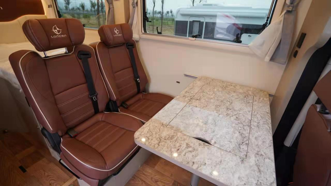 会客区设有乘用级双人沙发座椅(可双向调节),采用皮艺耐磨面料,质地柔软,乘坐舒适;座椅均配有安全带,保证行车时乘坐安全;侧面设置了大尺寸车窗,保证采光通风;顶部配有储物吊柜,用于存放旅行物品。