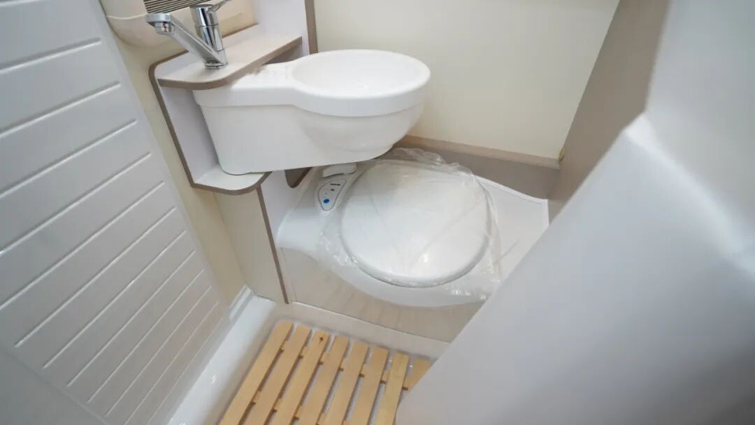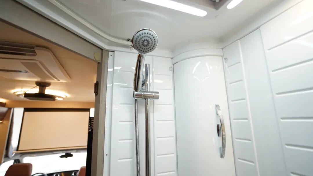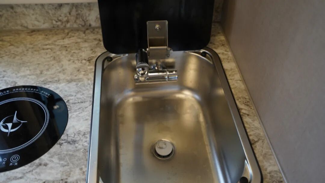 卫浴区采用干湿一体式设计,配有洗手盆、独立水龙头、赛特福德盒式坐便器、淋浴花洒等,满足户外旅行卫浴、洗漱需求;洗手盆采用可旋转设计,空间利用更高效。