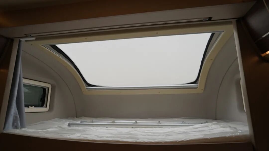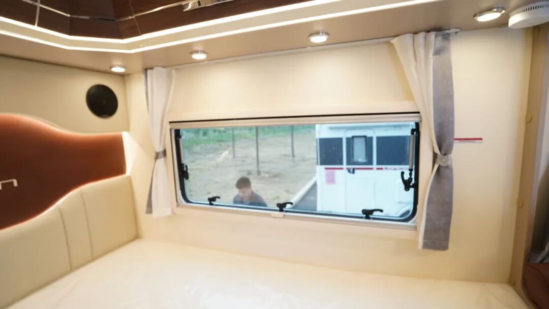 额头休息区设有大尺寸双人床,尺寸为2000x1500mm,可满足多人睡眠休息;侧面设有隐私帘,保护休息空间隐私;顶部超大尺寸天窗与两侧外推窗搭配,保证日常采光通风。