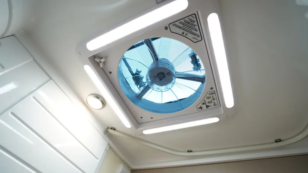 顶部配备照明灯、换气扇,满足卫生间照明、通风需求。
