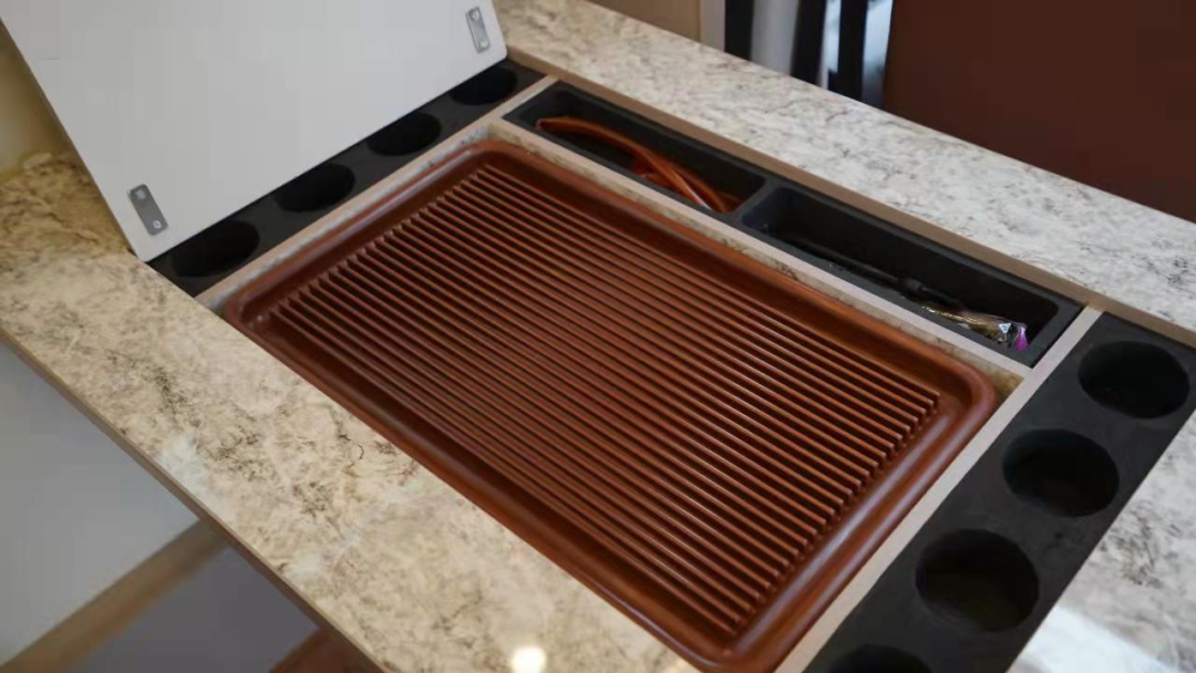 副驾驶座椅侧后方设有烧水装置,隐藏在置物板下方;底部是分格式储物空间,方便放置全套茶具、茶叶,拿取非常方便。