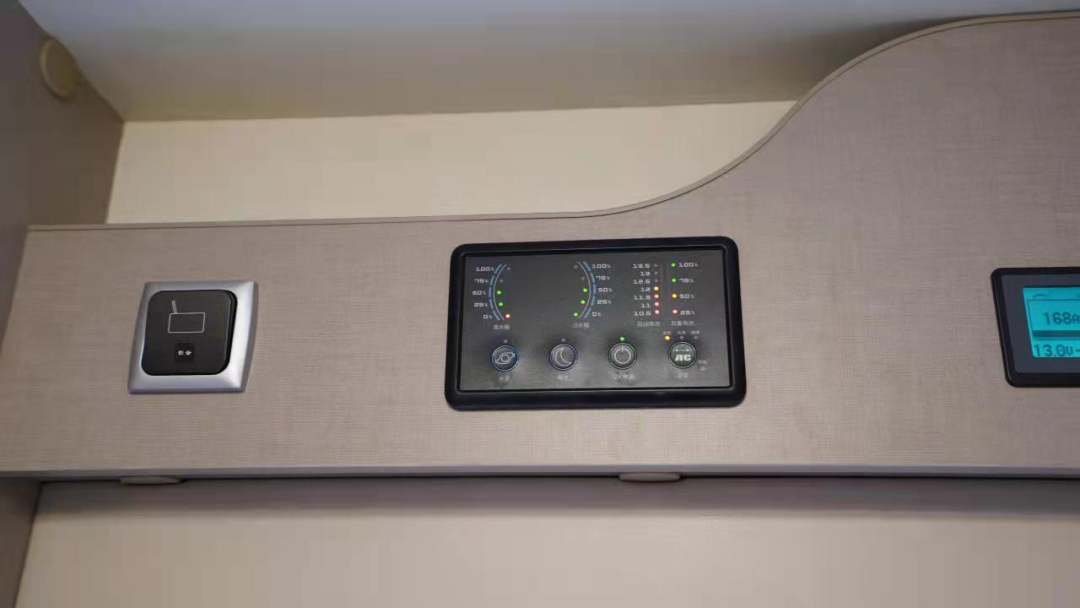 水电方面配备200L清水箱、100L灰水箱、清/污水箱手动排污阀、12V车载静音水泵换、800AH电池、3000W充逆变一体机、600W太阳能板等,满足户外旅行用水用电需求;车内配备水电、灯光集成控制系统,方便使用水电。