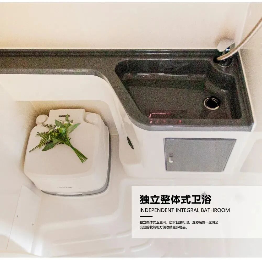 独立卫浴区位于厨房区对侧,采用ABS吸塑一体成型设计,防霉防水性能优异;内部配有便携式马桶、独立水龙头、洗手池、花洒等,满足日常卫浴、洗漱需求,另可选装赛特福德盒式马桶。