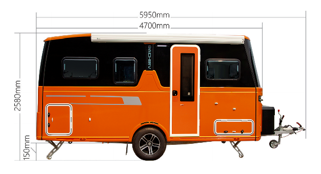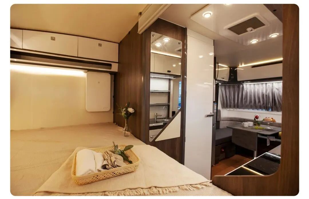 车身外侧配备了户外照明灯、重力加水口、快接式水管、市电接口、外置淋浴器、储物舱等设施,为户外生活提供便利,还可选装3x2.5m户外遮阳蓬,为户外聊天闲谈提供一个遮阳庇荫的休息场所。