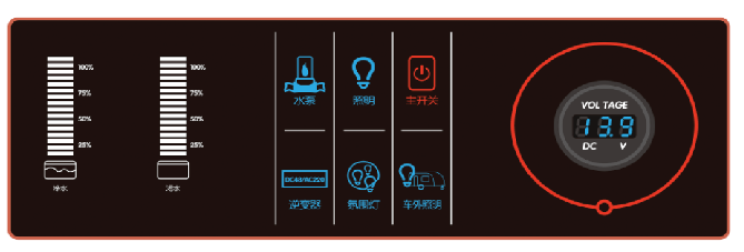 水电方面配备了120L清水箱、40L灰水箱、200W太阳能板、200AH胶体电池、3000W逆变器、水泵、行车充电线束等,满足户外旅行用水用电需求;另可选配洗衣机、小米电视、400W太阳能、400AH锂电等;车内还配备大驰智能房车自主研发的集成控制系统,显示整车清水、污水、水泵、灯光等状态,通过触摸操作控制,使用非常方便。
