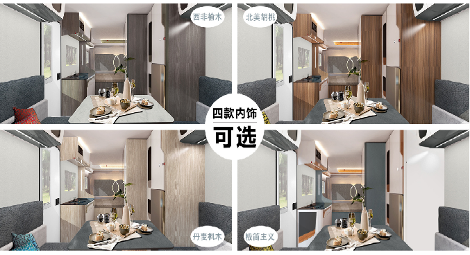 内饰共有四种设计风格可选,分别是西非榆木(高端绅士)、北美胡桃(低调高贵)、丹麦枫木(轻奢内涵)、极简主义(简约大方),可满足不同用户需求;家具采用轻质板材+塑胶地板搭配,质量轻,又耐磨耐用。