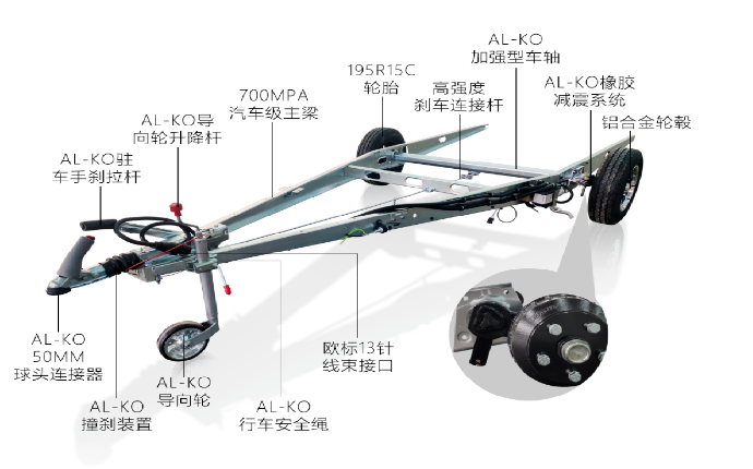 底盘采用德国爱科(AL-KO)车轴及牵引装置,承载性能优异,可有效防止行车时后车摆动,保障行驶稳定;可变截面大梁经过一体成型新技术处理,设有多处硬力释放孔,在保证强度和韧性的同时降低了重量;大梁还经过镀锌处理,拥有更好的抗腐蚀性。