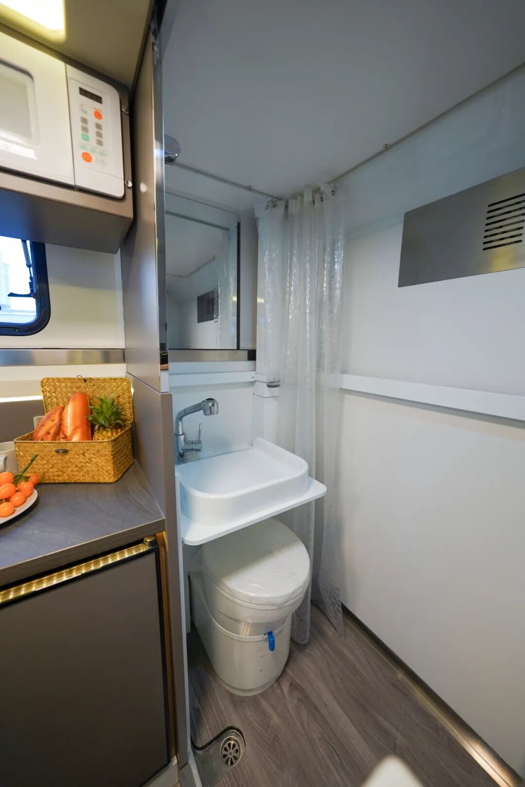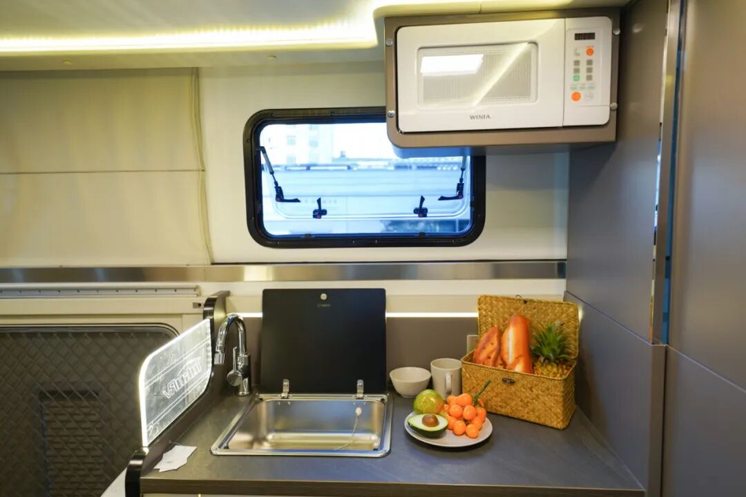 厨房区位于会客区对侧,各项配置齐全,操作空间适中,配有不锈钢洗菜池(带盖)、独立水龙头、电磁炉、微波炉等设施,下方内嵌了一台88L房车专用冰箱,用于储存烹饪所需食材。