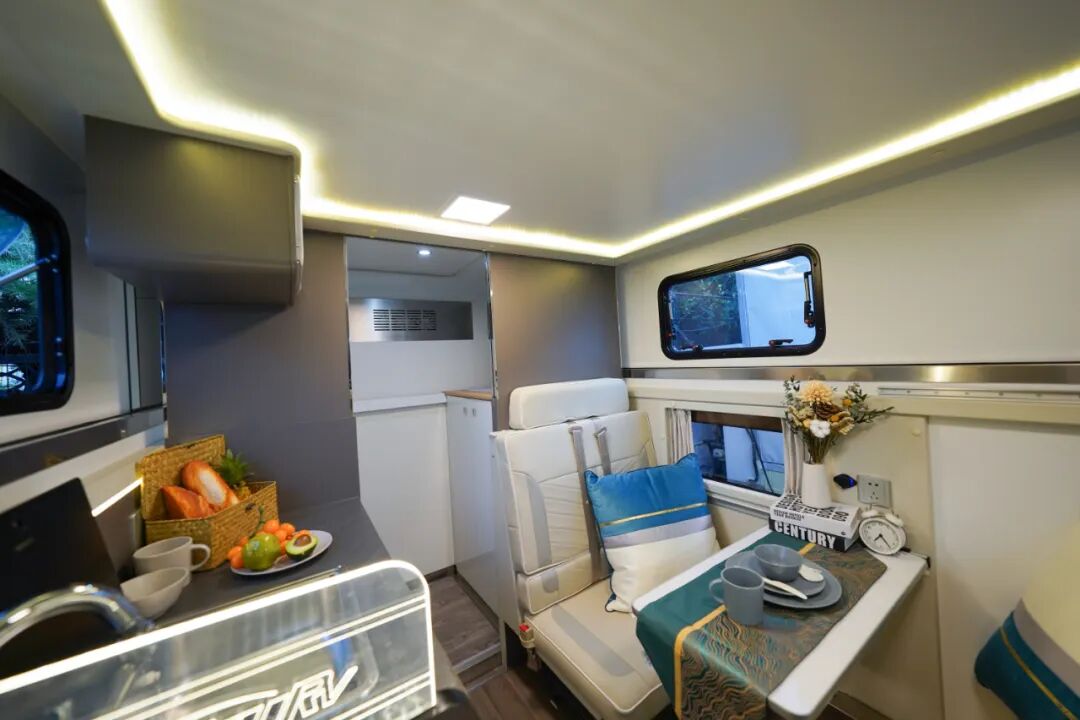 生活区素色超纤的内饰设计,主打轻奢时尚风格,塑造品质旅行生活;内部“额头床+沙发卡座”布局,解决了户外旅行休息的问题。