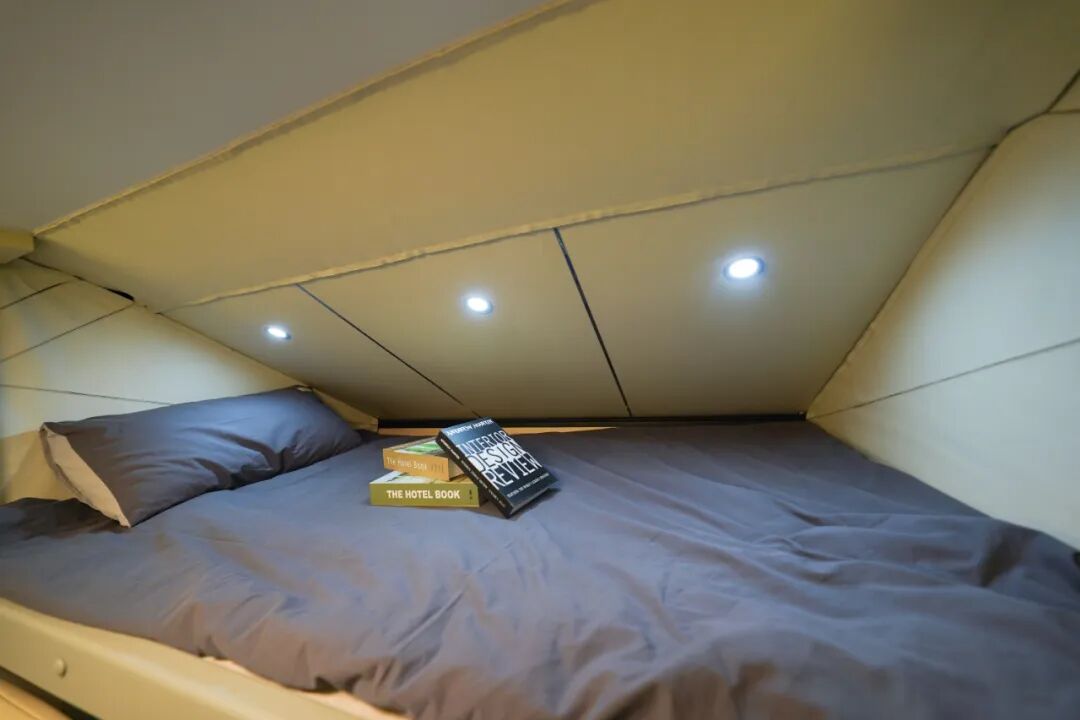 驾驶室上方是额头休息区,设置了一张可拓展双人床,拓展后尺寸可达1880x2000mm,满足多人睡眠需求。