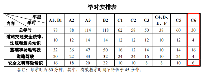 培训分为“道路交通安全法律、法规和相关知识”“基础和场地驾驶”“道路驾驶”和“安全文明驾驶常识”四部分内容。每部分内容培训结束后都会进行考核。总学时方面,C6驾照的总学时为30学时(每学时为60分钟),相较其它车型少上不少;准驾车型培训里程方面,C6驾照也没有其余准驾车型培训里程最低不得少于260公里的要求。