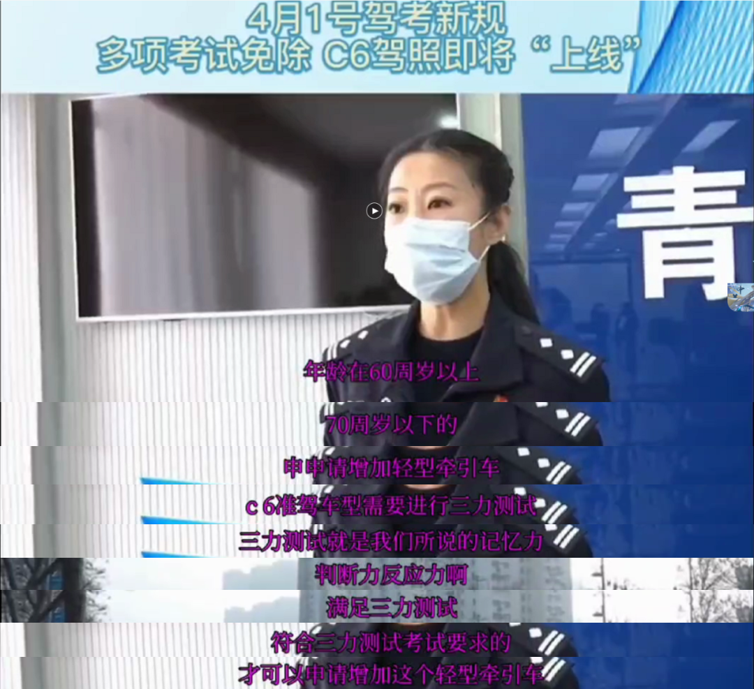 驾驶证指南的发布证实了昨天青岛交警对于C6驾照申领年龄做出的相关解释说明,这也意味着,未来年龄在60周岁以上、70周岁以下的人群,只需通过三力测试,即记忆力、判断力、反应力这三项,符合三力测试考试要求的即可申请增驾轻型牵引挂车。