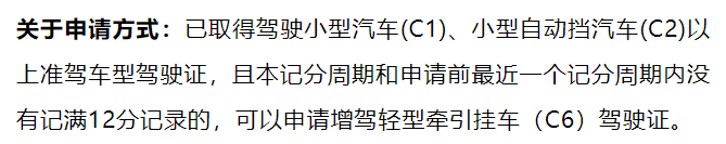 申请增驾轻型牵引挂车(C6)驾驶证需在以取得C1、C2以上驾照,且本记分周期和申请前最近一个记分周期内没有记满12分的才可以申请。