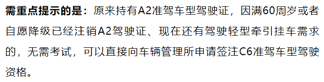 同时,申领轻型牵引挂车准驾车型(C6)驾驶证指南还针对以下事项中进行了说明: