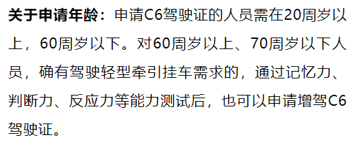 新修订的《机动车驾驶证申领和使用规定》将于4月1日起正式实施,为解答广大车友对于C6驾照的相关疑惑,近日,公安部交通管理局发布了申领轻型牵引挂车准驾车型(C6)驾驶证指南,并在申请年龄方面特别说明:对60周岁以上、70周岁以下人员,确有驾驶轻型牵引挂车需求的,通过记忆力、判断力、反应力等能力测试后,也可以申请增驾C6驾驶证。