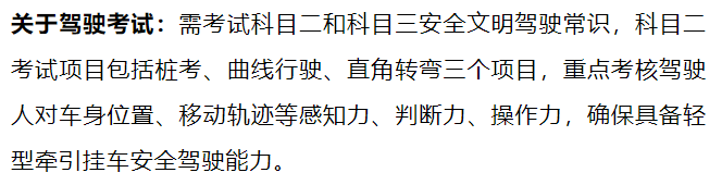 考试内容和之前文章提到的基本一直,只需考试科目二和科目三安全文明驾驶常识(即科目四),其中科目二考试项目为桩考、曲线行驶、直角转弯三个项目,重点考核驾驶人对车身位置、移动轨迹等感知力、判断力、操作力,以确保接受考核的人员具备轻型牵引挂车安全驾驶的能力。