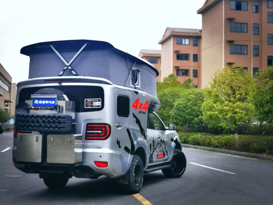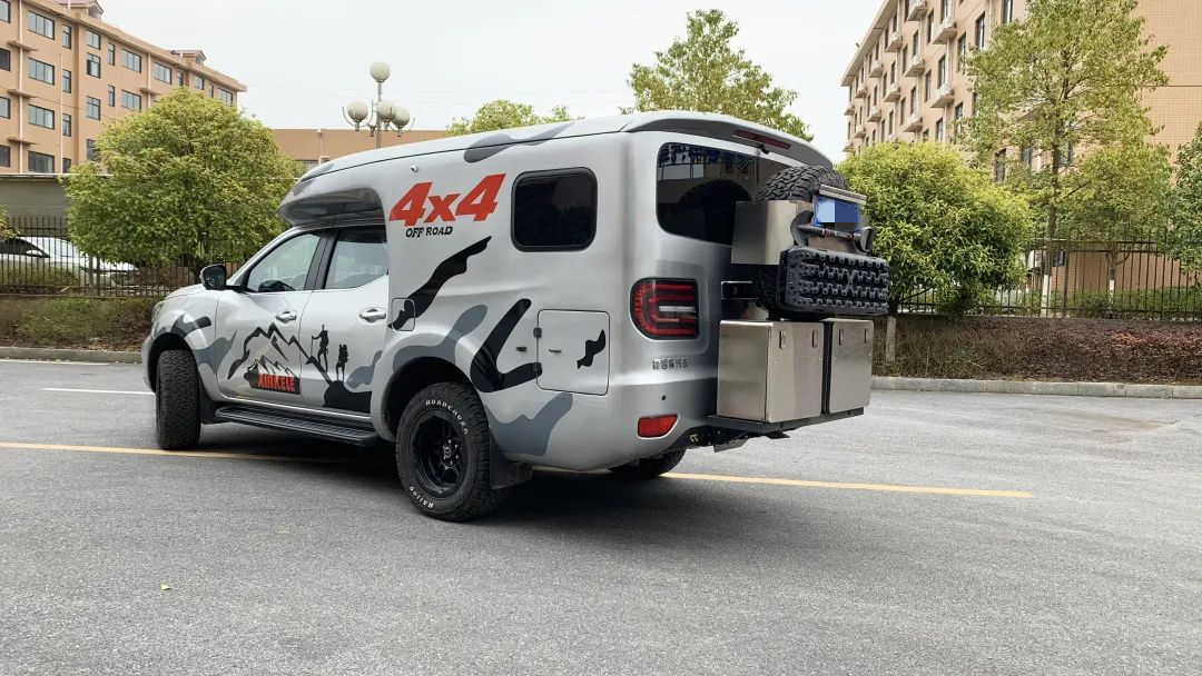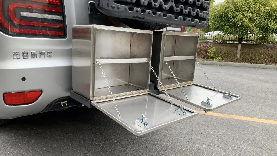 车厢采用轻量化设计,基于全铝一体式冲压工艺打造,整体质量更轻,强度更高;外侧配备了不锈钢上车扶手(真皮包覆)、抽拉柴油灶、市电接口、加水口等生活设施,为户外生活提供方便,另可选装自行车架等。