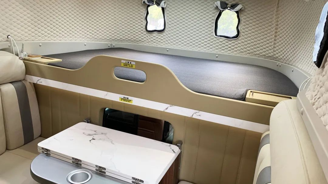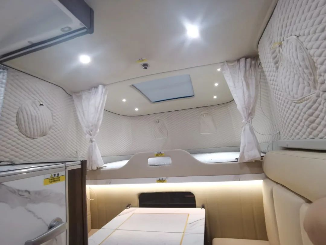 休息区设有豪华双人床,配有乳胶床垫,保证睡眠空间的舒适性;侧面设有床帘,保障休息空间私密性;顶部配备电动全景天窗,采光通风效果优异。