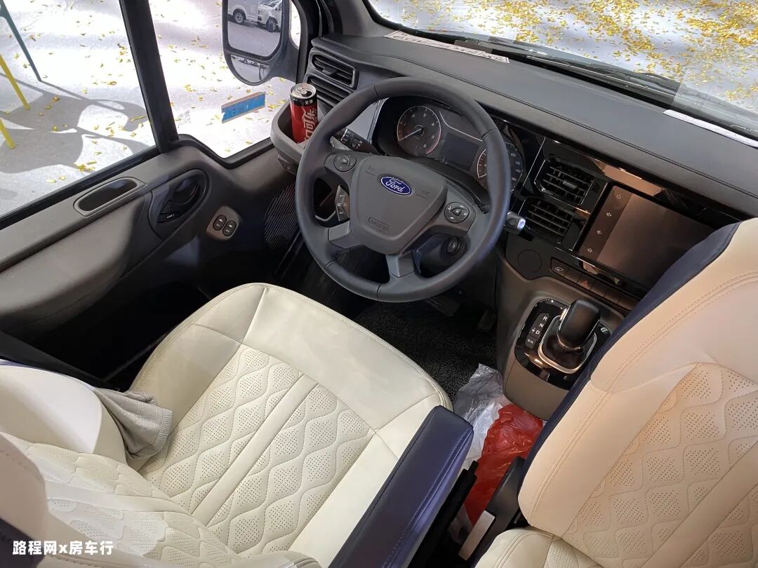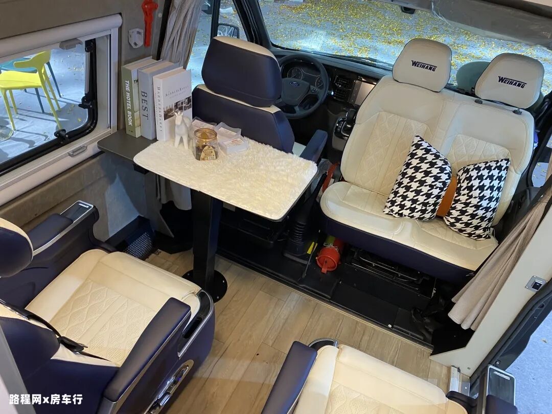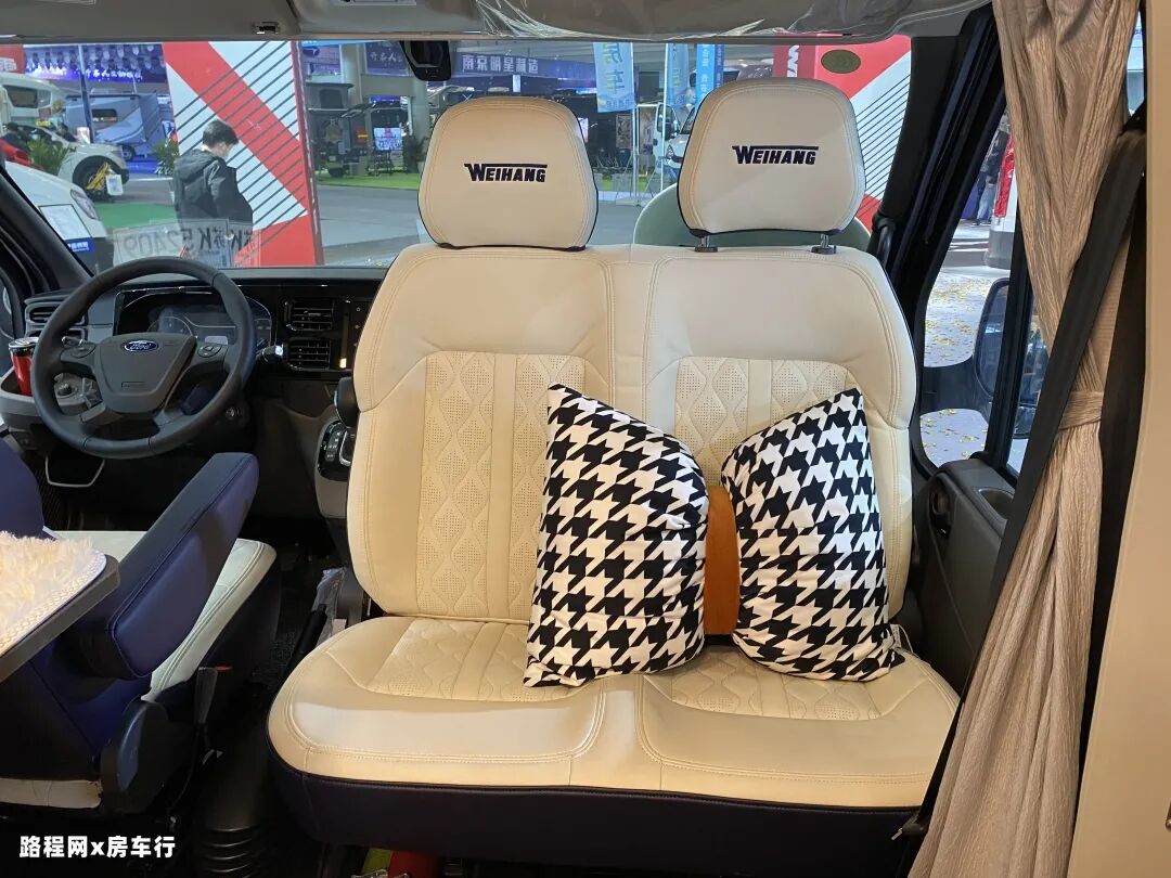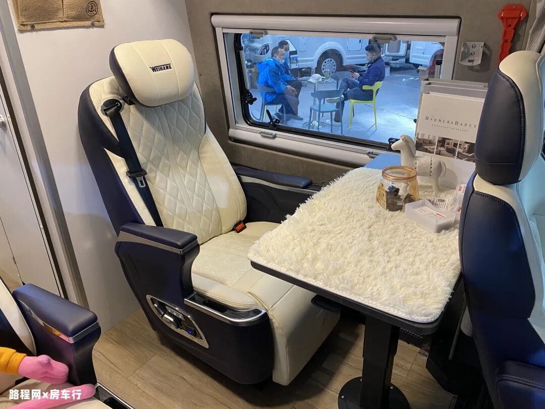 车内布局大气经典又富有特色,从前往后依次是驾驶室、会客区、厨房区/卫生间、尾部横床。驾驶室是三人座椅的设置,副驾驶双人座椅可向后旋转使用,增加了会客区的座椅空间。
