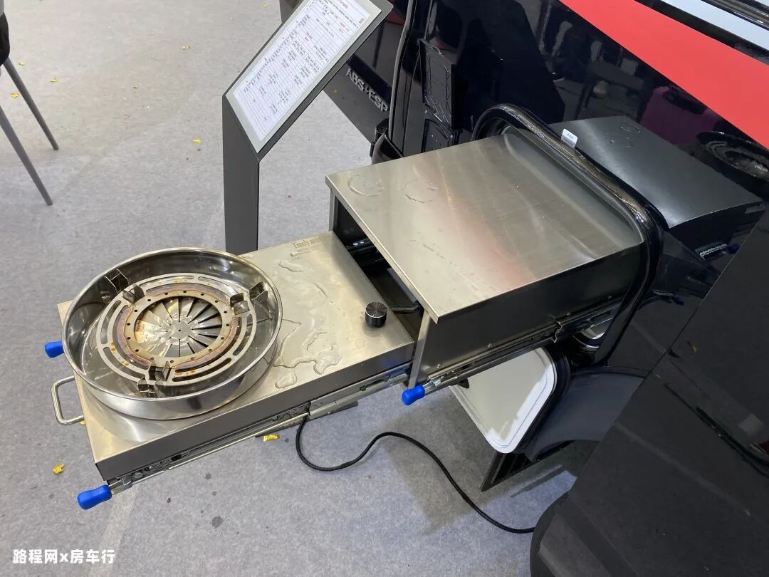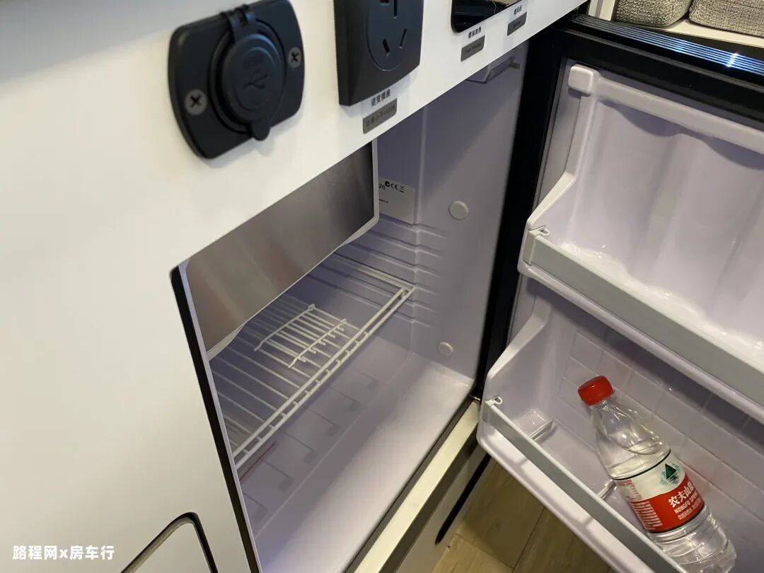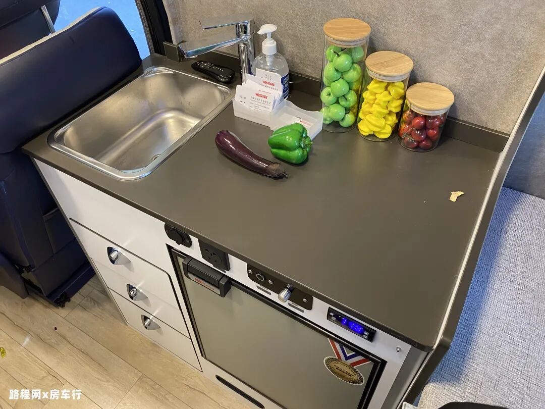 厨房区的空间虽然不大,但对于B型商旅车而言,室外烹饪或许更加适合。但室内厨房区的配置还是比较全的,洗水池、储物抽屉、车载冰箱等设施还是配有的。