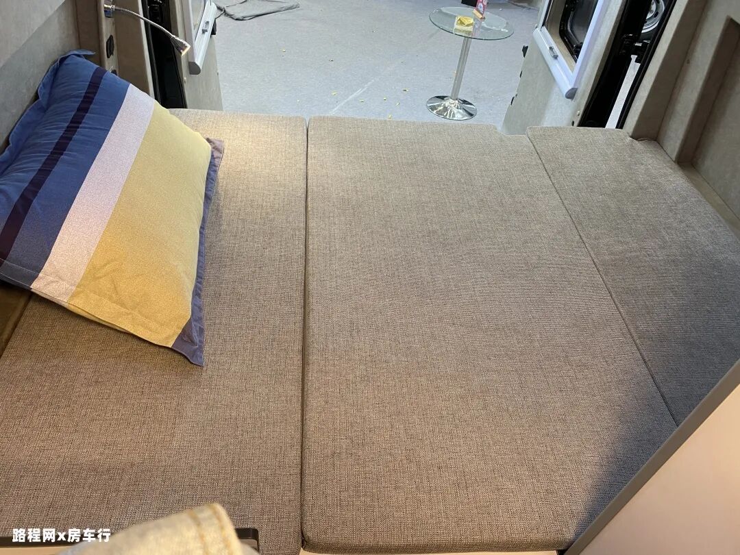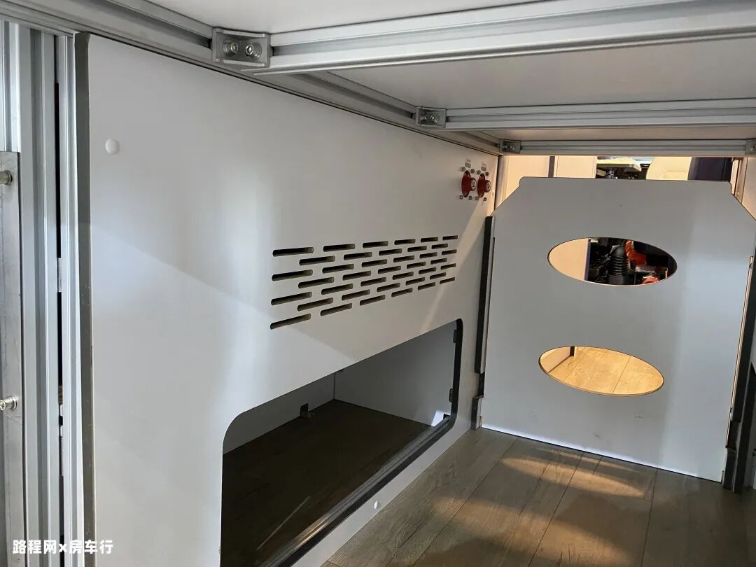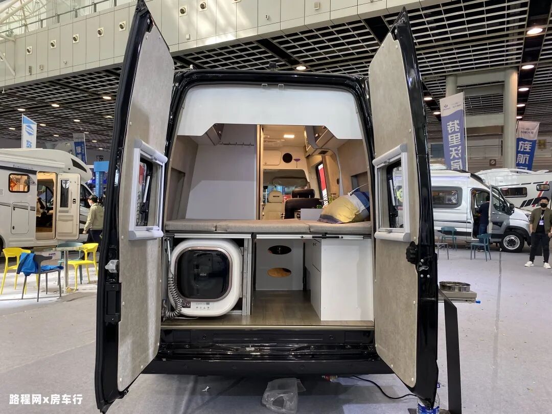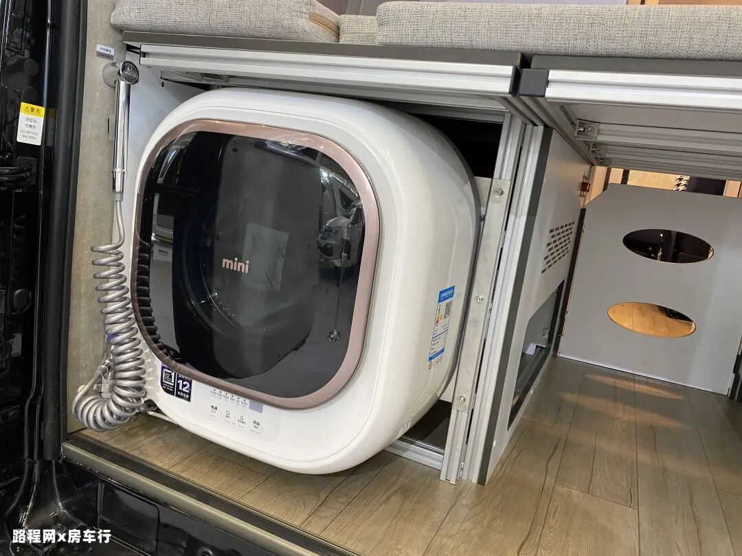 车尾设有双开门,打开车门就可看见车内的尾部横床,横床下方是mini滚筒洗衣机及多个储物空间,从尾部进行储物还是比较方便的。