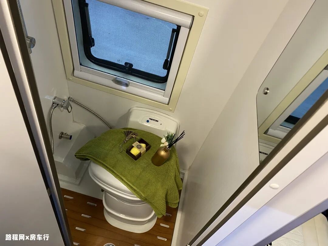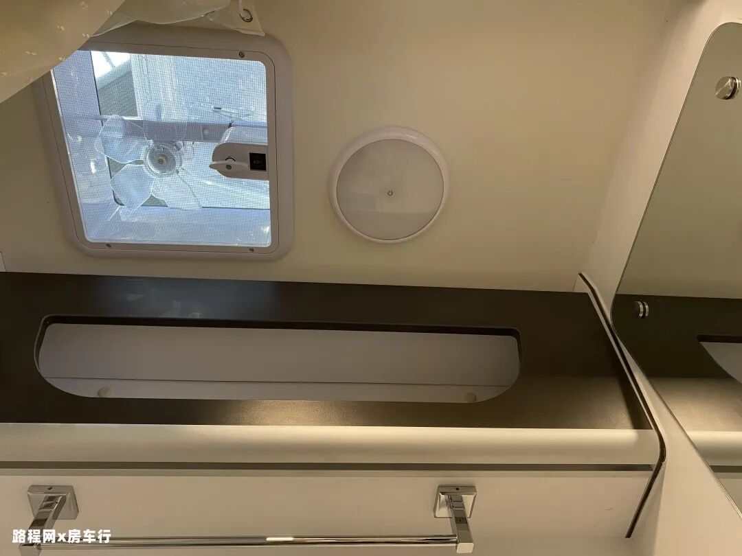 卫生间的空间在B型房车中来说还是可以的,内配电动排风扇、塞特福德抽拉马桶、淋浴系统、晾衣架、卫浴镜等设施,日常洗浴可以解决。