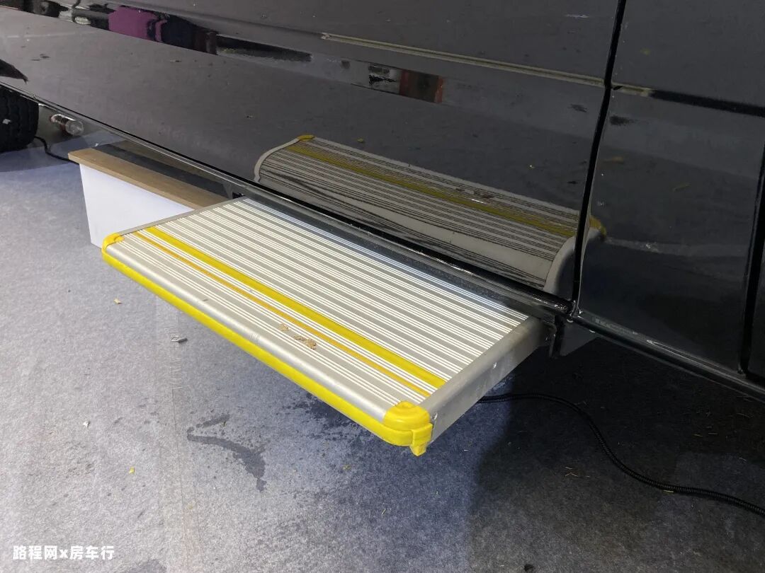 车身右侧配置丰富,菲亚玛户外遮阳棚、电动踏板、外抽抽拉燃气灶等设施均有配置。抽拉炉灶旁边还设有多孔插座,便于车外用电。