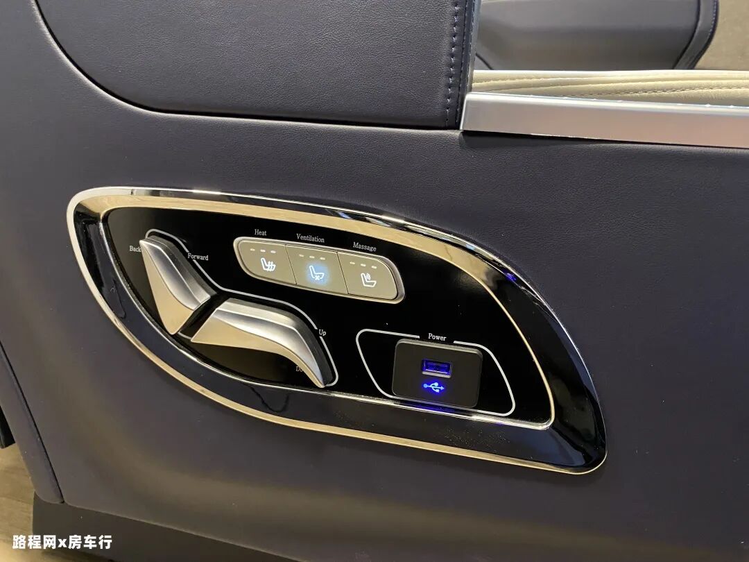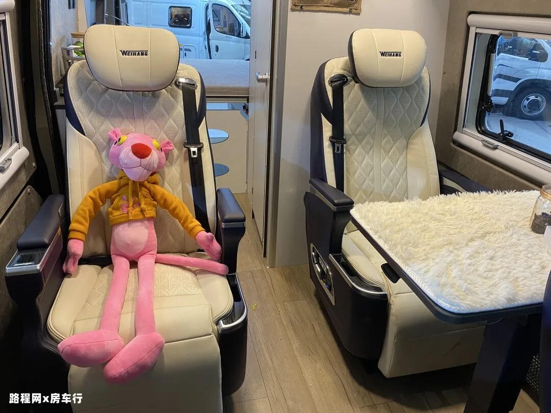 驾驶室后方的会客区配有双航空座椅,航空座椅带有加热、通风及按摩的功能,并且可以调整靠背的前后角度问题,腿托部分也能调整其承托高度,非常适合在疲惫游玩之后放松享受。
