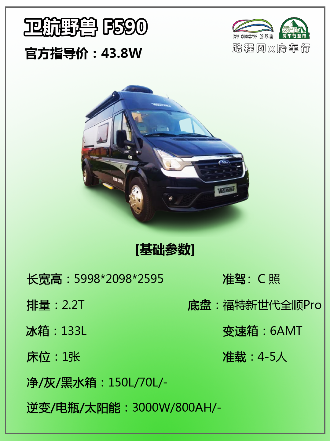 水电设施方面,卫航野兽F590房车是配置了3000W逆变器、800AH铅酸电池、150L清水箱和70L污水箱。该车的市场指导价是43.8W,更多房车测评可持续关注路程网x房车行。