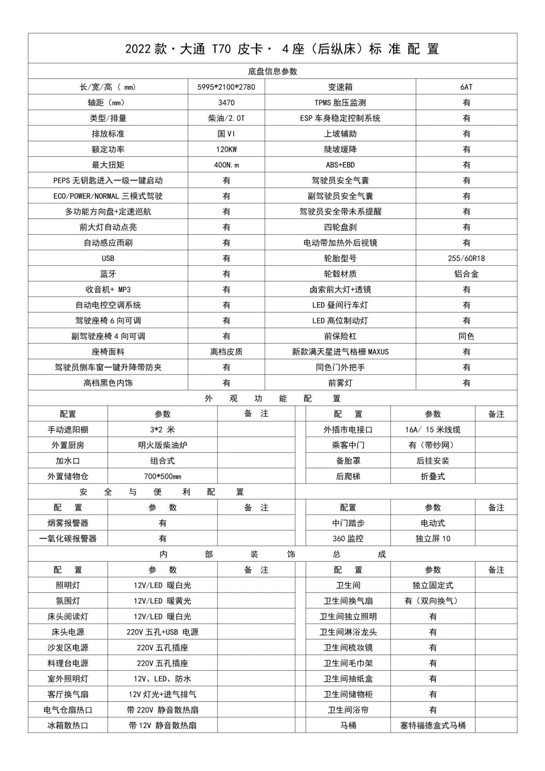 整体的尺寸为5995*2100*2780mm,2.0T的柴油发动机,6AT变速箱,最大功率为120kW,最大扭矩为400N·m,国六排放,全新的四驱系统,布局方面可选横床(1900x750mm)或纵床(1900x1800mm)布局,额头床尺寸均为1900x1800mm。