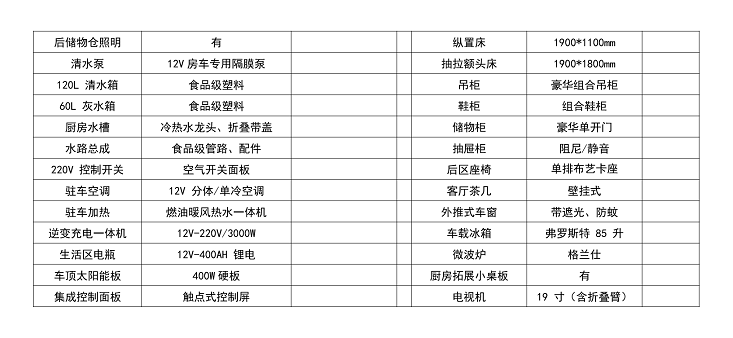 整车尺寸为5940*2110*2750/2930mm,基于大通V90加长轴底盘打造,2.0T柴油发动机,6AT变速箱、后驱后双胎;配有3000W 逆变器、400Ah锂电池、120L清水箱、50L污水箱。
