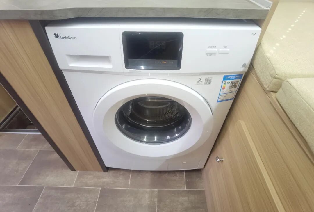 橱柜右侧设置了大尺寸操作台,方便处理食材,下方还内嵌了一台洗烘一体洗衣机。