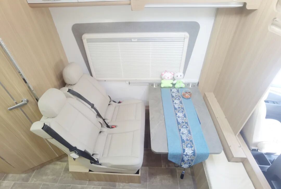 网红4号轻卡房车生活区采用经典“额头床+沙发卡座+尾床”布局,休息空间充足,可以满足一家四口旅行休息;内饰家具选用E0级环保板材家具和地板革,健康无污染,旅行更舒心、舒适。