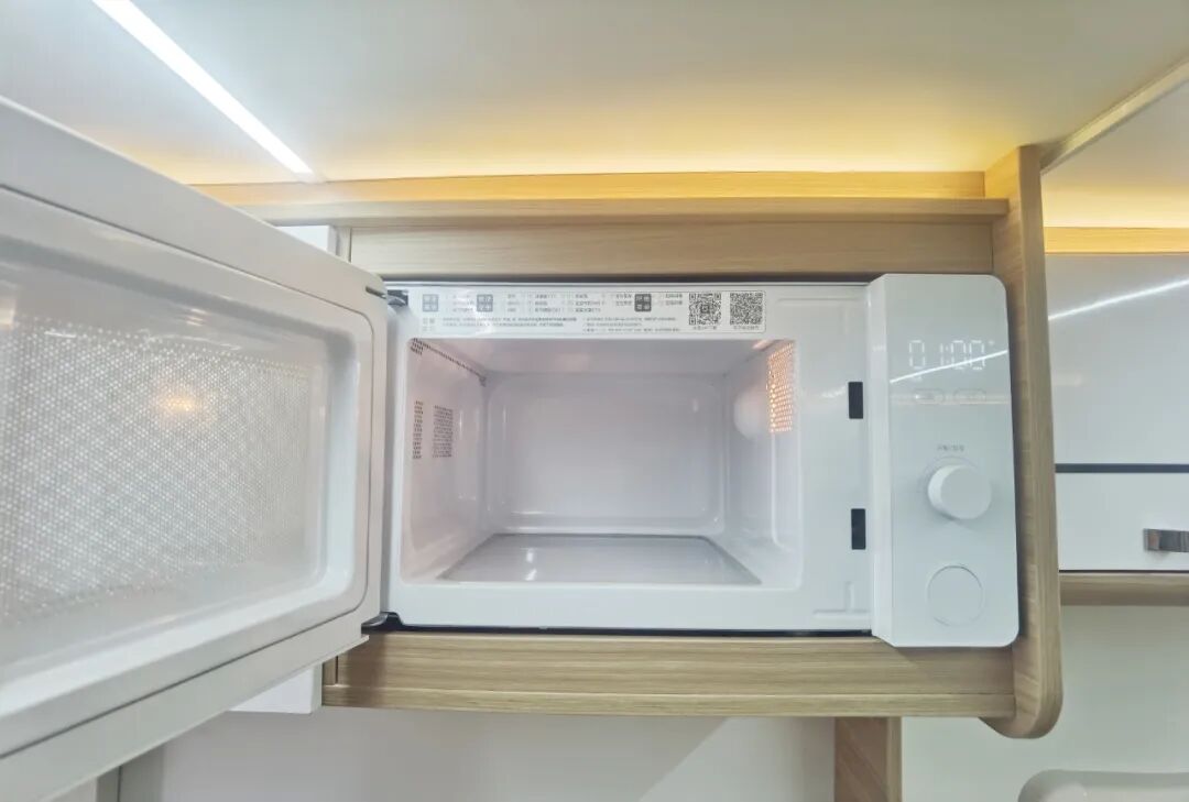 顶部吊柜内嵌了一台微波炉,方便快速加热食物。