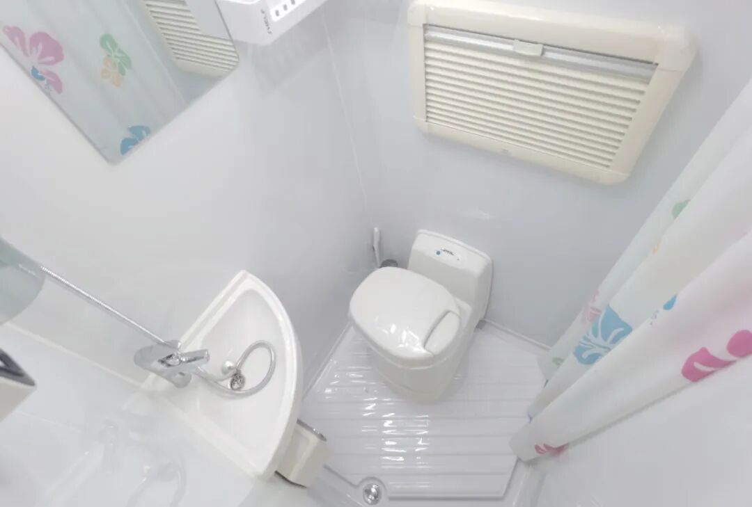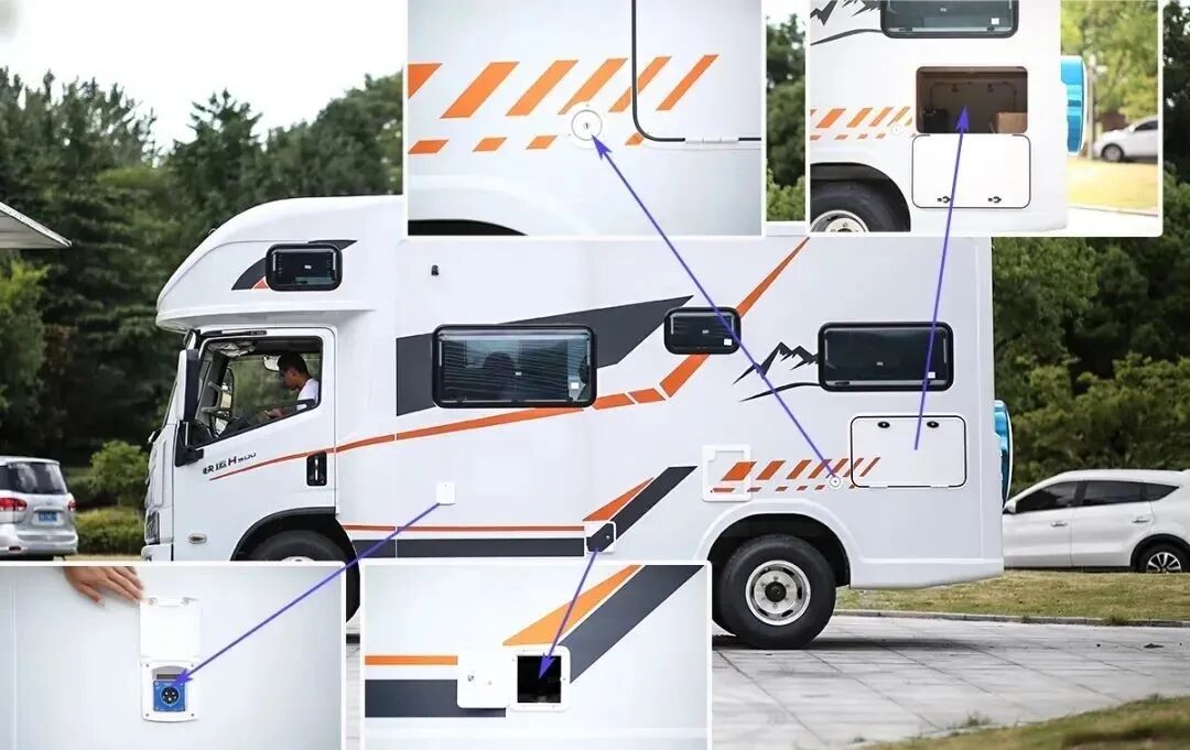 车身外侧设有户外遮阳蓬、电动踏步、重力加水口、外置花洒、储物舱等生活设施;车厢采用一体成型白色玻璃钢厢体,整体性强,保温隔热性能也非常出色。