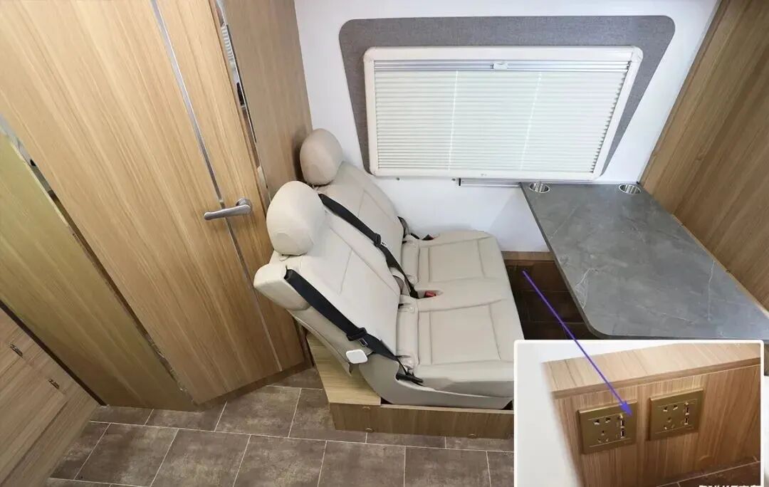 卡座侧面配有五孔电源插座及USB接口,方便娱乐休息时为电子产品充电。
