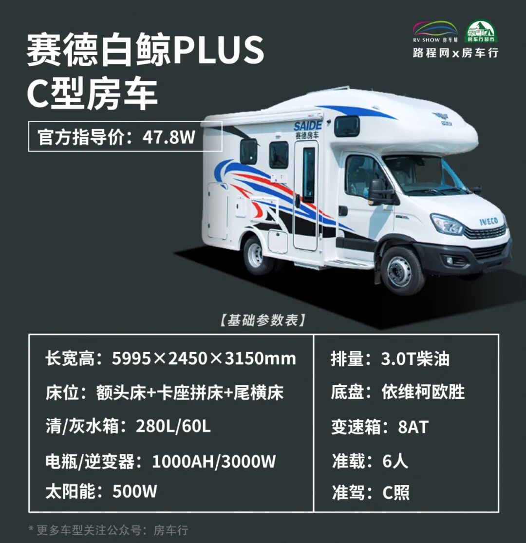 整体来看,赛德白鲸PLUS房车各项生活配置齐全,外观也非常靓丽,内部生活区鞋柜以及集成控制系统等设计,为旅行生活提供了方便,提升了旅行生活品质;价格方面,这款房车的官方指导价为47.8W,喜欢的车友欢迎评论区下方留言!