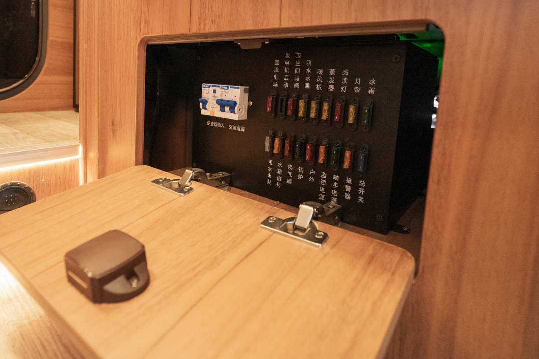 卡座下方设有整车水电控制总成,包括灯光、电器、监控等调控开关。