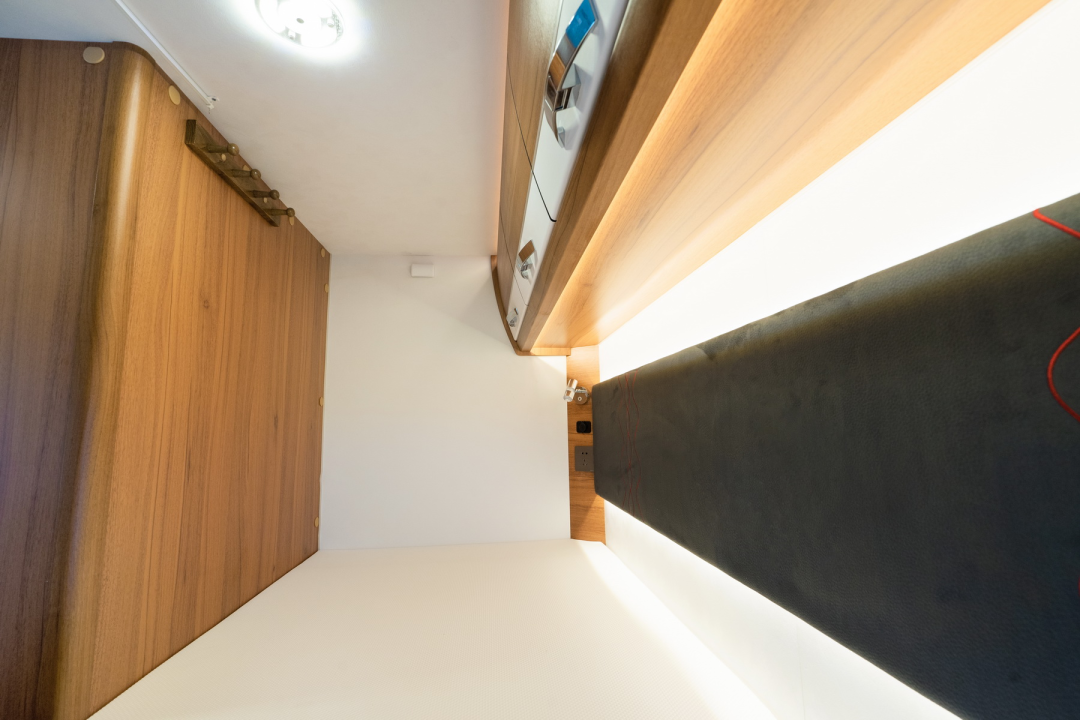 尾部休息区横置了一张双人床,可满足多人睡眠需求;顶部配有储物吊柜,可存放日常衣物用品;吊柜对侧设有衣架,可以挂一些常穿的衣服。