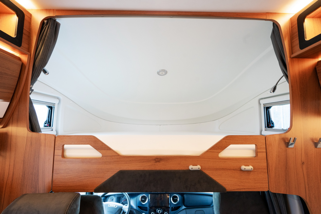 额头休息区设有大尺寸双人床,供日常休息使用;床面铺设慢回弹海绵床垫,长期使用也不会变形,睡眠更舒适;两侧设有车窗,满足日常采光通风的需求;侧面设有隐私帘、房车专用蹬床梯,为睡眠休息提供方便。