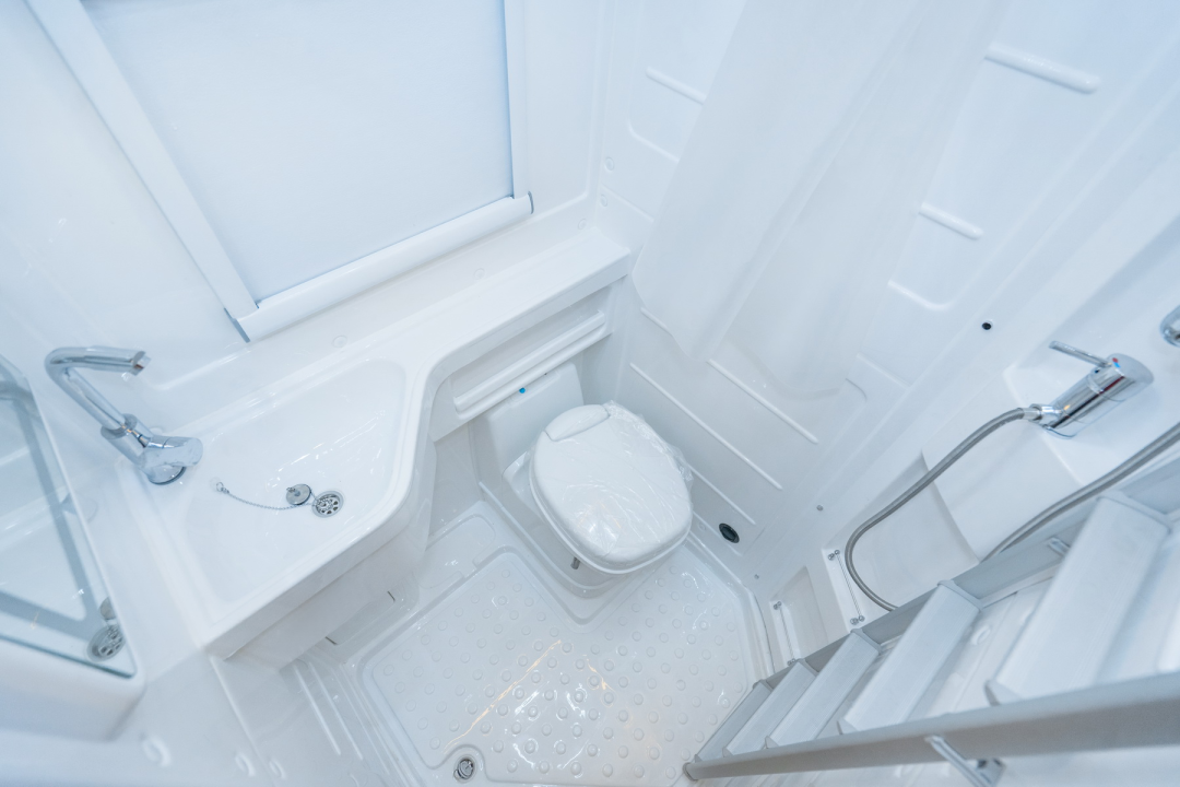 吸塑一体式卫浴区配有洗手池、水龙头、防水浴帘、花洒、毛巾架、赛特福德盒式马桶等,满足日常卫浴、洗漱需求;地面铺设纯木防滑垫,洗浴时起到防滑效果。